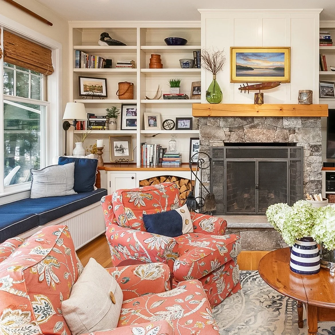 Take a look into the heart of this beautiful NH home, where we built custom fixtures, including a custom fireplace and hearth, built in shelving, and more!